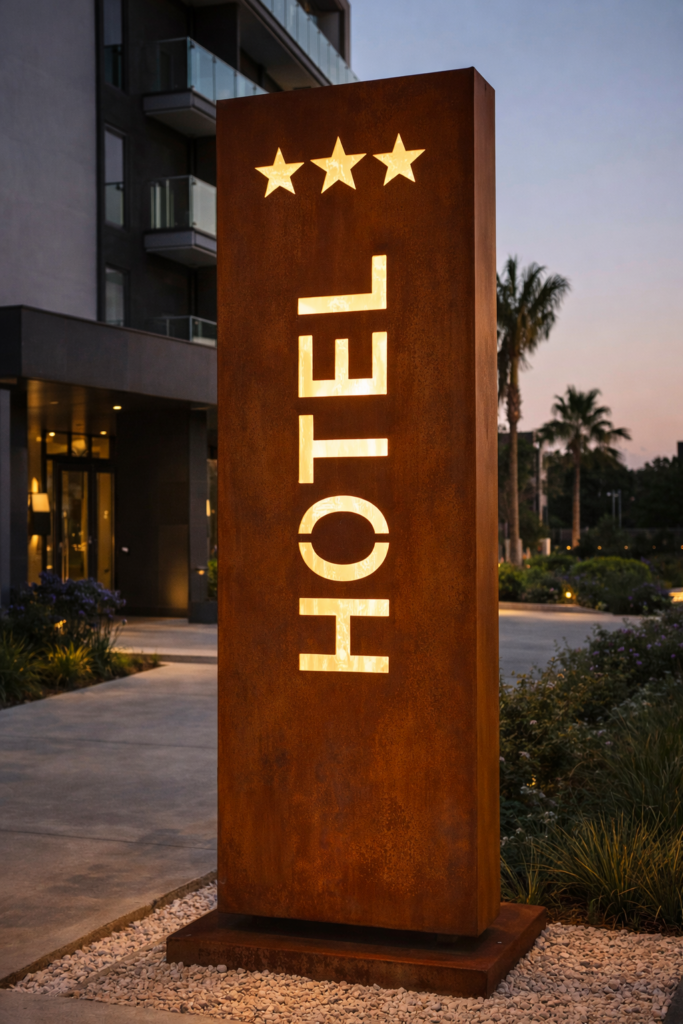 El acero corten es un material ideal para proyectos que buscan una estética distintiva y moderna. Su acabado oxidado en tonos rojizos aporta un carácter único y elegante, muy utilizado en letreros, fachadas y elementos decorativos.